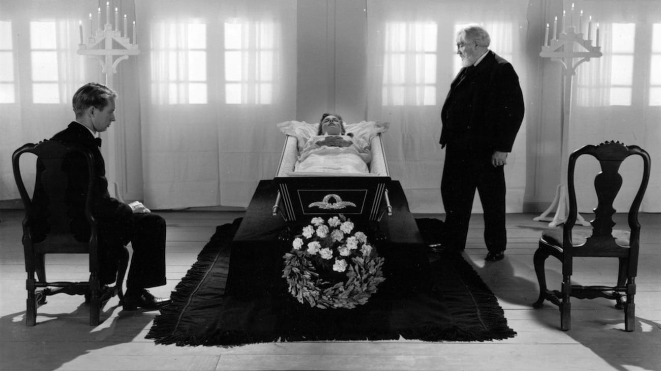 Also divine is Dreyer’s staging of the sequence, which makes this space look like a place where a miracle of this kind is possible. With Inger’s coffin in the center, framed by seven-candle mounts on each side of her, the sparsely appointed room has a gentle, diffused light coming through the translucent curtained windows before her. There’s a lot of drama preceding the moment when the lid is finally having to get lowered over Inger’s body, including Mikkel finally bursting into tears, without the Christian comfort of feeling like she’s gone to Heaven. (“It is all so meaningless, so meaningless,” he says. “I only know that everything I loved and worshiped is now to be buried in the earth to rot, to rot and rot.”)