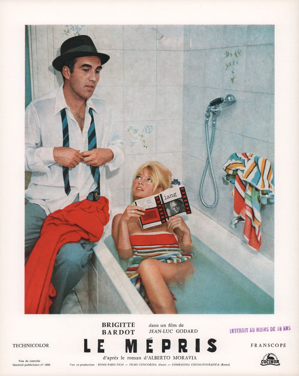 Premise: At the famed Cinecittà studio in Rome, boorish American producer Jerry Prokosch (Jack Palance) is trying to complete shooting on a screen adaptation of Homer’s The Odyssey, but he’s in conflict with his director, Fritz Lang (playing himself), and wants someone to rework the script. To that end, Prokosch hires French playwright Paul Javal (Michel Piccoli), who occupies a nearby flat with his glamorous wife Camille (Brigitte Bardot). When Prokosch starts flirting shamelessly with Camille—and Paul, in turn, flirts with Prokosch’s secretary Francesca (Giorgia Moll)—it exposes a rift in Paul and Camille’s marriage that widens during an epic domestic spat.