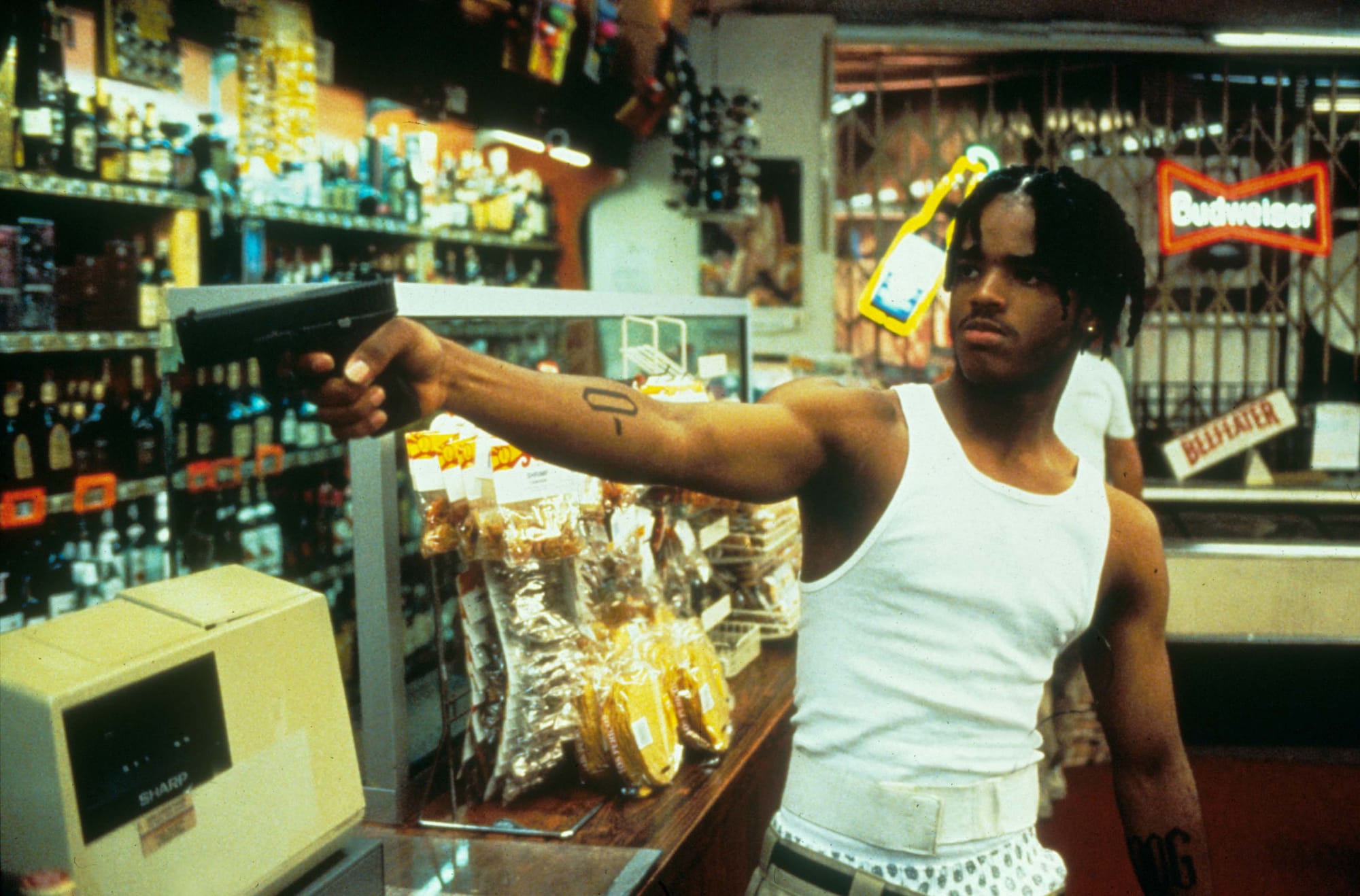 If a movie teaches you how to watch it in its opening moments, Menace II Society instructs viewers to stay on edge and throw out assumptions. In the first scene, Caine and his younger friend O-Dog (Larenz Tate) enter a corner store to buy some liquor. They win viewers’ sympathies when the the store’s owners eye them suspiciously and follow them around in a none-too-subtle bit of racial profiling. They’re underage, sure, but do they deserve this? Then, provoked by an insulting remark, O-Dog shoots the man behind the counter. Then he shoots him again and again (and again) before forcing the man’s wife to retrieve the surveillance video. Then O-Dog kills her, too. Then he empties his first victim’s pockets and even his socks to find the big bills he knows will be hidden there. (That the victims are both Asian further complicates the scene.) Caine looks on in horror and then flees, but otherwise does nothing to change his life, including putting any distance between himself and O-Dog.