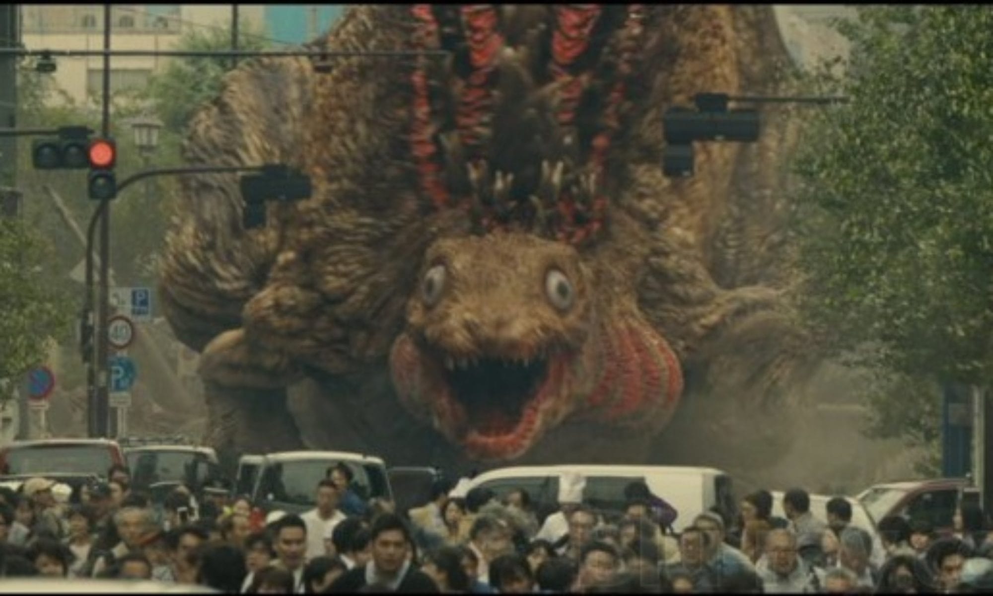 When Godzilla makes his first appearance in the 2016 film Shin Godzilla it’s not his size that strikes terror. It’s the eyes. Sure, the size helps, but this fresh-start take on the atomic-powered monster arrives in Tokyo with a pair of unblinking eyes that betray no hint of any kind of inner life. Later to evolve into a more familiar, dinosaur-like beast, Godzilla first crawls ashore as a kind of super-sized lungfish, spewing liquid from his gills and leaving destruction in his wake as his unthinking body lurches through the outskirts of the Japanese metropolis. He doesn’t care what it kills or even seem to comprehend what he’s doing at all. He’s literally a walking disaster, one that can’t be reasoned with or easily defeated, one that has to be endured — if that’s possible.