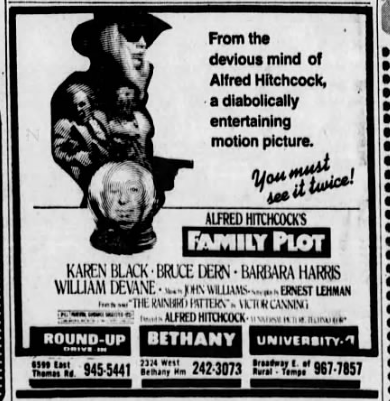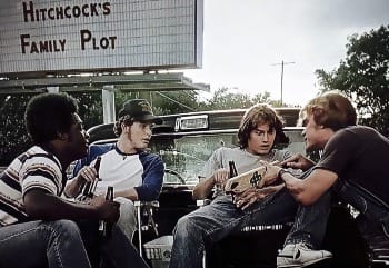 As the sun starts to set on their unnamed Texas town, the teenaged characters of Richard Linklater’s Dazed and Confused make plans for the night, last-day-of-school acts of debauchery involving booze, weed, and hazing. They don’t even seem to notice the drive-in marquee looming over the parking lot where senior girls are subjecting incoming freshmen to ritualized humiliation. But chances are, they’ll get around to seeing Family Plot, Alfred Hitchcock’s final film, sooner or later, if they haven’t already. There’s only so much to do in a town like that, and in towns like it across America. And while drive-in theaters, though not as popular as at their post-War heights, would soon experience a severe blow with the popularization of home video, that was a few years in the future. In the summer of 1976, the drive-in remained a spot to see a movie. Or two or three.