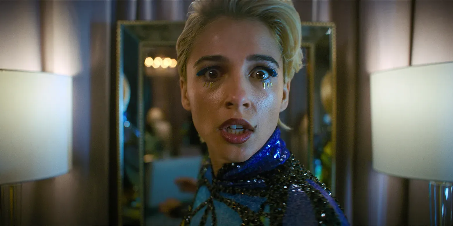 First the compelling part: After an audacious and violent opening tying up a loose end from the first movie, Smile 2 shifts to the rarefied world of Skye Riley (Naomi Scott), a pop superstar making her first cautious steps toward a comeback a year after a car accident killed her movie star boyfriend and sent her to rehab. (That she does so via an appearance on The Drew Barrymore Show feels like a nod to yet another horror landmark.) Still in pain and unable to procure anything but over-the-counter painkillers, she seeks out Lewis (Lukas Gage), an old friend with a ready supply of drugs. This turns out to be a mistake in more ways than one. Beyond jeopardizing her recovery, she risks exposure to, well, if you’ve seen the first movie you know.