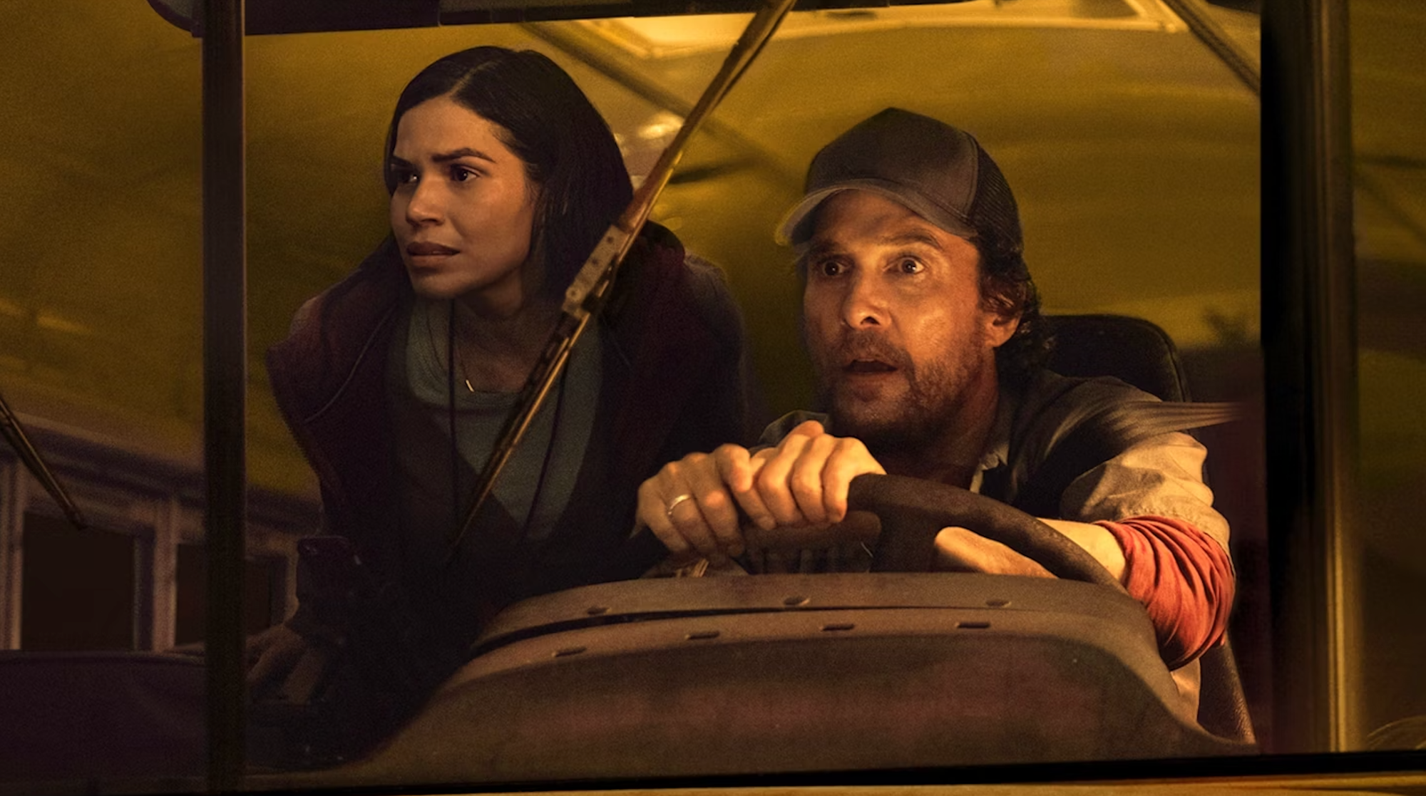 Adapted from Lizzie Johnson’s non-fiction book Paradise: One Town’s Struggle to Survive an American Wildfire, The Lost Bus offers a likable stock character in Kevin McKay (Matthew McConaughey), a down-on-his-luck single father who’s at odds with his teenage son and struggles to look after his disabled mother. (The son and the mother are also played by McConaugheys, Levi and Kay, respectively, so two docu-realist points for that.) As a school bus driver, Kevin begs his dispatcher (Ashlie Atkinson) for more hours to help make ends meet and he winds up getting more overtime than he bargained for when a wildfire starts spreading around the area. He’s given the simple assignment of transporting 22 schoolchildren and their teacher, Mary Ludwig (America Ferrara), from their classroom to another location out of harm’s way, but the fire gets to their destination faster.