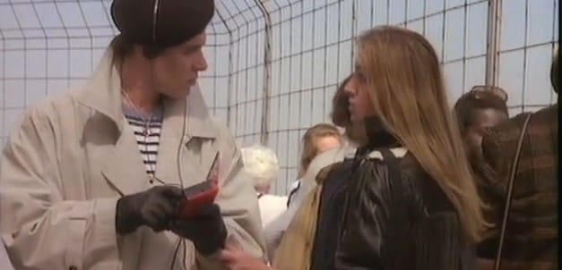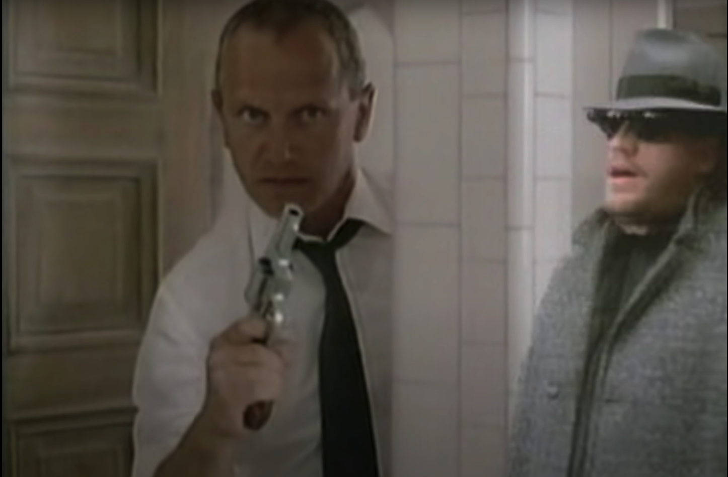 Dressed in a trenchcoat and dark glasses, Beverly Hills Cop score composer Harold Faltermeyer is following the clues of some sort of mystery as this video opens. But, by the end, Faltermeyer’s black-and-white noir image has merged with that of the film via shots that drop him into the Beverly Hills Cop action, including a couple of moments in which he runs “alongside” Eddie Murphy and Judge Reinhold. (Forrest Gump or Zelig or even the “Elevation” video this is not.) The look on Faltermeyer’s face suggests he knows just how silly it looks.